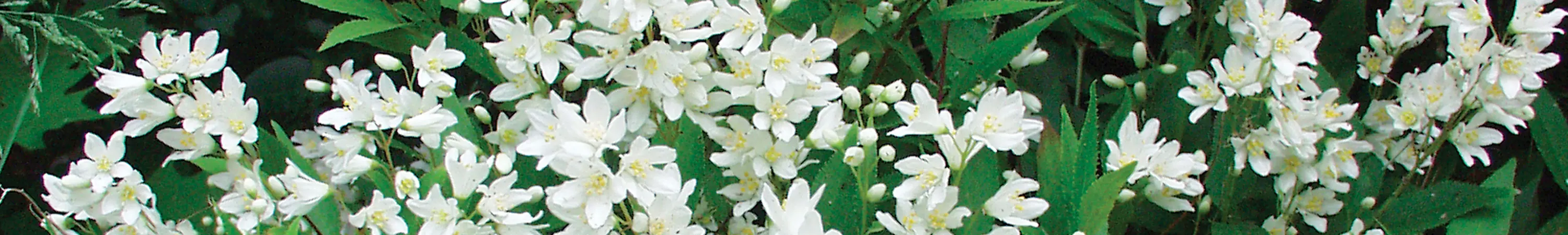 Deutzia is a low growing perennial shrub well suited for small spaces or use as a ground cover. Gently arching branches are covered in flowers in late Spring.